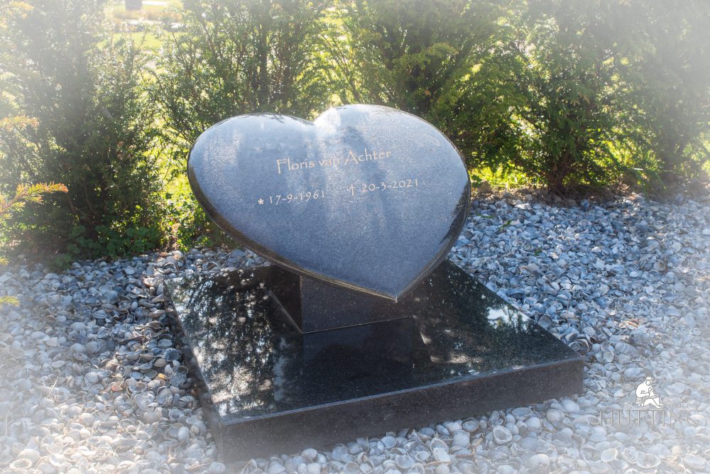 Een stijlvol grafmonument dat gemaakt is gemaakt van Star Galaxy graniet. Star Galaxy graniet is een zwarte granietsoort met een goudkleurig glimmertje. Het hart is volledig uitgewerkt en rust op een sokkeltje dat geplaatst is op een voetplaat. Bekijk al onze grafstenen met hart.